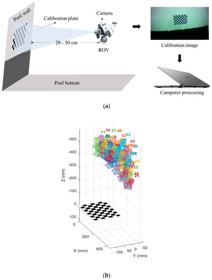 In this paper, a single-plane checkerboard grid calibration method was used to obtain the distortion correction coefficients and camera internal parameters. The calibration plate is a 10 × 7 grid, and the ROV was manipulated to take 49 images in the pool. The image shooting positions are shown in Figure 3. More than 3 images are required for normal calibration, and the more images, the more accurate the calibration results.