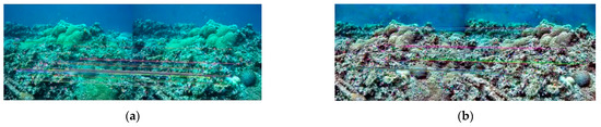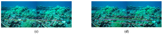 The image of Test 1 is clearer than Test 2, but the number of ORB feature matches is less than that of Test 2 because the image texture of Test 2 is richer than that of Test 1. In Figure 7, about ¼ of the image is transparent seawater, and the lack of texture makes it difficult to extract feature points, which also leads to fewer feature matches than Figure 8. The two datasets in this paper have different scenes and different numbers of images, so there is no way to compare them directly. We chose to compare the differences between the image enhancement and the original image results, thus assessing the effectiveness of the image enhancement method in clear (Test 1) and turbid (Test 2) seawater.