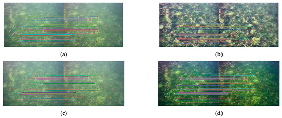 Feature matching results of the Test 1 dataset. (a) Original image; (b) CLAHE; (c) MF; (d) DCP.