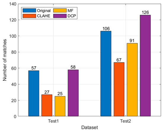 As can be seen from the results in Figure 10, the CLAHE and MF methods do not improve the number of image features matched but are lower than the original image. For MF, compared to the original image, the image edges were smoothed and the contours were more blurred, so the number of feature matches was less, and the effect of this change was mitigated in Test 2, where the image itself was more blurred. The number of feature matches of the CLAHE method instead decreased when the image contrast increased, probably due to its introduction of new noise. The DCP method has the largest number of ORB feature matching, especially in the Test 2 dataset: the DCP has 20, 59, and 35 more features than the original image, CLAHE, and MF, respectively, and the feature matching effect is the best.