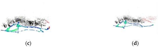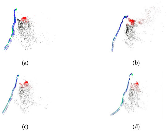 To further evaluate the effect of image enhancement in underwater SLAM, images from the Test 1 and Test 2 datasets were imported into the ORB-SLAM2 algorithm to obtain the trajectory and point cloud map of the ROV. Among the ORB-SLAM2 algorithm results, there are mainly camera poses and trajectories, and sparse point cloud maps. Blue represents the camera pose, green the camera motion trajectory, black the global point cloud map, and red the local point cloud map. The point cloud map and the trajectory of the camera constitute the relative positioning, which is the main basis for ROV positioning. The ORB-SLAM2 results are shown in Figure 10 and Figure 11.