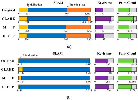 The result graph shows that after image enhancement, the key frame trajectories differ from the original data, but the overall trend is still consistent. Throughout the SLAM process, the main parameters of initialization, tracking lost, key frames, and point clouds are counted, as shown in Figure 12. In the Test 1 dataset, the SLAM initialization times are all around the 200th frame, and the initialization time difference is less than 1 s based on the 25 frames per second of the camera. The DCP initialization time is the fastest, with the initialization completed at frame 196. The original data, MF, and DCP tracking is lost around frame 900, with a similar number of key frames and point clouds. CLAHE suffers from tracking loss at frame 1403, the longest SLAM duration, and the highest number of key frames and point clouds. No relocation occurred after four tracking losses. In the Test 2 dataset, the original data and DCP were the fastest to complete initialization, at frames 22 and 48, respectively, much faster than the CLAHE and MF methods, and there was no tracking lost. The CLAHE obtained the most keyframes and the least point clouds.