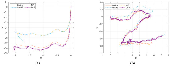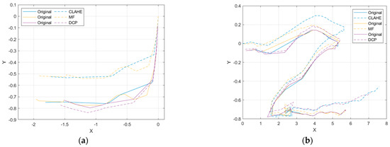 In the Test 1 dataset, the RMSEs of CLAHE, MF, and DCP are: 0.175, 0.167, and 0.030, respectively, and the error between the DCP and original trajectory is the smallest. In the Test 2 dataset, the RMSEs of CLAHE, MF, and DCP are: 0.280, 0.131, and 0.196, respectively, and the error between the MF and original trajectory is the smallest. It is not that DCP did not perform well in Test 2, because in the first half of the trajectory, the RMSEs of CLAHE, MF, and DC are: 0.166, 0.122, and 0.060, respectively, and DCP still has the lowest RMSE. Since the Test 2 dataset itself is more ambiguous, the accuracy of the motion trajectory in DCP is higher.