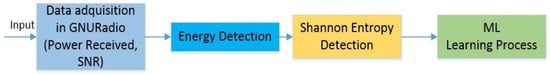 23], the authors implement an SVM technique based on the SNR and the calculated Rényi entropy of the energy signal, and the results show that there is an improvement in the detection compared with ED for low SNR values. It starts with signal conditioning and filtering; this information is recorded for the learning process, which recognizes a PU in some modulations for several SNR values. After this, the classification process is made in real time to find the PUE.