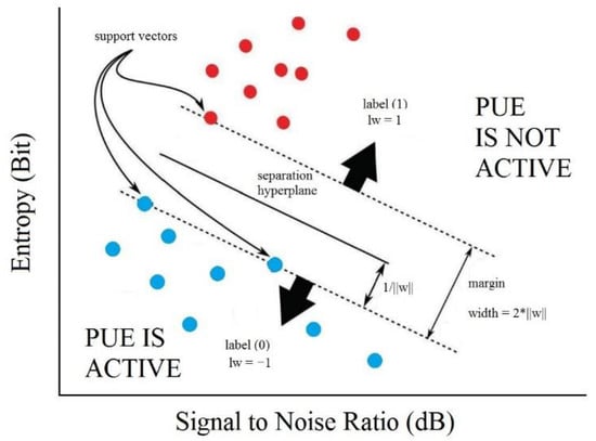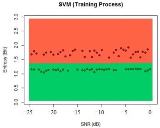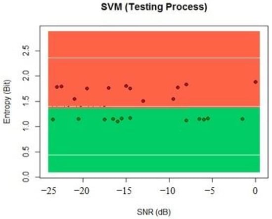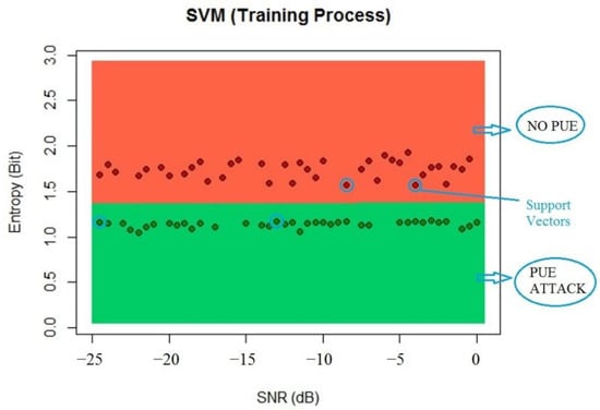 For our proposal, the input data for the SVM are the estimated entropy of the received signal and the measured SNR. The classification problem in this case is to detect if there is a PUE presence in the radio environment, which is achieved by comparing the entropy values and the SNR when PUE is on and when it is off. Then, we have three inputs to the system, the entropy in bits, the SNR in dB, and a binary variable that tells the system if there is a PUE attack. Then, the decision is made for each SNR value, and the supported vectors allow the linear kernel to separate the entropy for each SNR value. This algorithm maximizes the separation of the supported vectors, allowing better results than other techniques for PUE attack detection systems. The output of the system is the final decision that a PUE attack was detected in the radio environment at the selected frequency. An example of the application of the SVM for PUE detection can be seen in