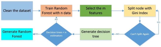 The main process is divided into two parts: the first is to calculate the decision trees individually, and the second is to apply the majority rule to classify the data. For this objective training, a set must be randomly selected, the random forest must be calculated, and the nodes must be split. In this last part, the Gini coefficient is calculated, and the feature with the lower value is selected as the split feature. The calculation of the coefficient is made according to [