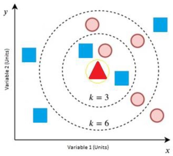 Figure 6—it is used to classify an unknown bidimensional sample (green) by using the training set with two variables, blue and red. As an example, if we select k = 3, most of the neighbors are blue, so the final decision is that the new data belong to blue. If we change it to 6, the result shows that most of them are red, and we have to take care in the selection because if we select an even value for K and the results for the two classes are the same, the algorithm will not make a final decision [