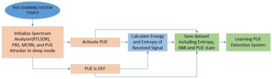 The next step is to use energy and entropy detection algorithms with the previously collected data to generate a final entropy calculation for each SNR value, which will be used as the input for the learning process of the machine learning algorithms. The decisions are based on three inputs, the SNR value and entropy of the signal, and if there is an active PUE. As we activate the PUE in the SDR, the third value is known and recorded in the database.