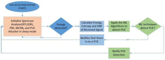 Currently, machine learning (ML) techniques are used to detect PUE attacks. The process is divided into two stages. The first stage is to train a machine with the data available, and once it is trained, it can classify the variables on the basis of the received signals. SVM is an option and has been used as a classification process [