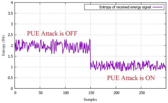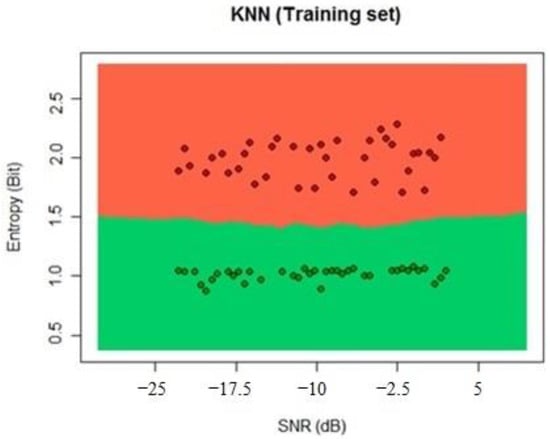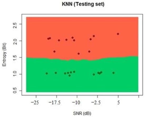 For this case, we used the estimated entropy of the received signal and the measured SNR as the input variables, and for each SNR value, we chose five neighbors to make a stable decision. The result shows whether a PUE attack is present or not by analyzing whether the neighbors have been identified as active or not in the previous learning process.