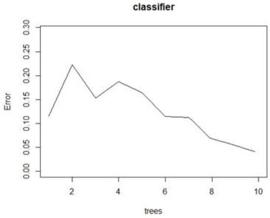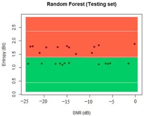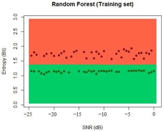 After the definition of the technique, the input data for the random forest are the estimated entropy of the received signal and the measured SNR, which are the features for the training of the random forest, with the same parameters for the splitting of 75% for training and 25% for testing. We choose 10 trees for the random forest, as is analyzed in
