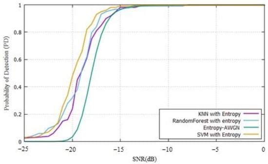 23]. The simulations used the same parameters found in the literature, and the results using the SDR showed that this solution worked even with low SNR values. A detection above 90% was found close to −18 dB, and with these results, the SVM worked better than other methods by 5%. The random forest and KNN results were very close and worked better than entropy by approximately 10%.