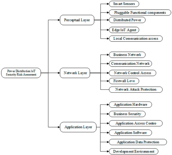 The establishment of the evaluation index system of PDIoT should conform to the principles of systemic and scientific evaluation and be operable, and the evaluation indexes should be independent of each other [11,12]. According to the fact that the PDIoT has a similar architecture to other IoT applications and is basically the same in terms of technology and functional level, and the security flaws of PDIoT mainly come from three aspects: sensors, network, and terminal devices, we abstracted it into three levels: perception layer, network layer, and application layer [13]. We recorded these three levels as the first-level evaluation index, referring to the relevant standards of the PDIoT, and established a second-level evaluation index under each first-level index, with a total of 16 indicators, as shown in Figure 1.