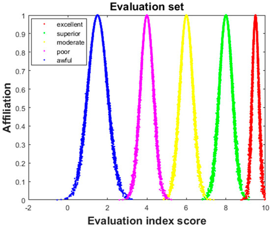 According to the algorithm of the forward cloud generator, the affiliation degree of each evaluation index score belonging to a certain safety evaluation level was calculated by Equation (8). The process of determining the affiliation degree is illustrated by taking the case of the secondary indicator smart sensor A11 under the primary sensor factor A1. From Equation (8), the affiliation degree of the index corresponding to the five security levels is ,, ,, and. According to the principle of maximum affiliation, employee culture A1 has the highest degree of affiliation for , so the security level is “superior”. Similarly, other indicators can be determined with the corresponding affiliation of their safety evaluation level.
