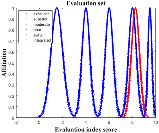 The resulting weights calculated by the entropy-weight method are shown in Table 4, and according to Equation (8), the eigenvalues of the integrated cloud of the evaluation system were calculated as , , and. The integrated cloud model was plotted using Matlab (see Figure 3) and compared with the cloud model images of each security level.