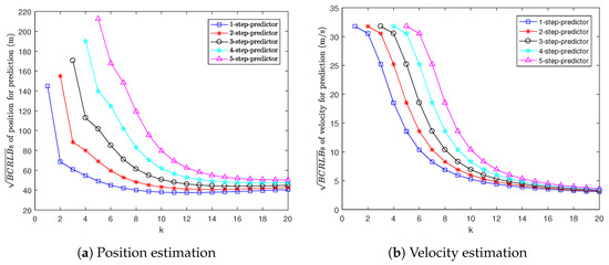 As is well known, assessing the performance of estimators is of great significance. The posterior Cramér-Rao lower bound (PCRLB) defined as the inverse of Fisher information matrix (FIM), also called Bayesian Cramér-Rao lower bound (BCRLB), provides a lower bound on the performance of estimators for nonlinear systems [41,42], Ch. 4 of [43]. In [44,45], a recursive BCRLB was developed for the filtering of nonlinear regular dynamic systems in which the current measurement is only dependent on the current state directly. Moreover, the BCRLBs for the prediction and smoothing of nonlinear regular dynamic systems was proposed in [45]. Compared with the conventional BCRLB, a new concept called conditional PCRLB (CPCRLB) was proposed in [46]. This CPCRLB is conditioned on the actual past measurements and provides an effective online performance bound for filters. In [47], another two CPCRLBs, i.e., A-CPCRLB and D-CPCRLB, were proposed. Since the auxiliary FIM is discarded, A-CPCRLB in [47] is more compact than the CPCRLB proposed in [46]. D-CPCRLB in [47] is not recursive and directly approximates the exact bound through numerical computations.