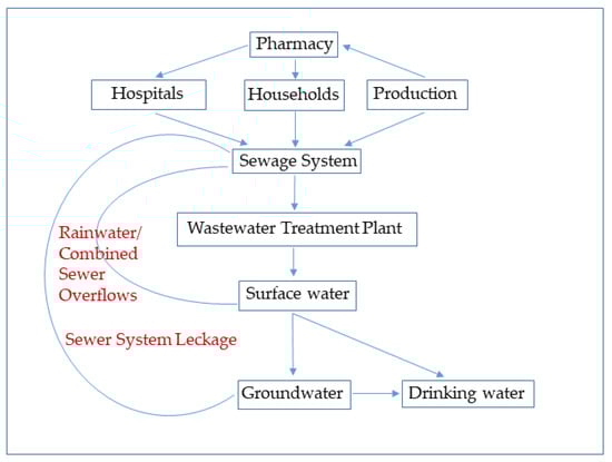 Municipal wastewater treatment plants were designed to treat domestic wastewater, not to reduce, for example, pharmaceuticals, pesticides and microplastics. Biologically, WWTP remove protein, fat and carbohydrates, as well as the important plant nutrients carbon, phosphorus and nitrogen from the water [,]. It must be considered that today’s conventional wastewater treatment technology (mechanical and biological steps) was designed in the 1970s []. This fact underlines to the problem that many substances are not even covered by the normal sum parameter monitoring of a WWTP, thus the chemical inventory of the wastewater is not known, meaning that it cannot be completely purified with the available treatment stages []. In fact, most of the conventional WWTP are not designed to eliminate organic compounds at low concentrations, making the treatment processes vulnerable and triggering a dissemination of micropollutants all over the environmental compounds (Figure 1) [,].