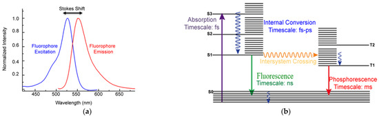 Wavelength shift due to Stokes shift, (a); Jablonski diagram, (b) (adapted with permission from []. Copyright 2015, American Chemical Society).