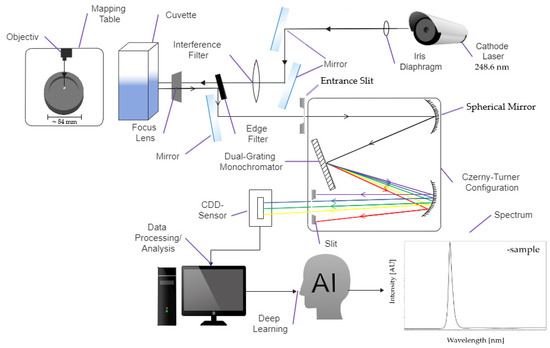 Figure 4 shows a detailed illustration of the measurement setup. The incident laser light is focused by an array of mirrors where the aperture and light intensity are controlled by two iris diaphragms. An interference filter ensures a monochromatic light. Only one wavelength of 248.6 nm is transmitted through an additional built-in interference filter. The light that is reflected back from the sample reaches the laser-blocking lens via an achromatic objective. This lens almost reflects the Rayleigh radiation that is emitted by the sample and is transparent to the incoming Raman radiation. The sample is measured inside a quartz glass cuvette, a movable flow cell or placed onto a rotary table. The emitted fluorescence signal is then edge-filtered and spectrally separated by a monochromator. The light enters the monochromator through an entrance slit, the size of which can be adjusted. A larger slit decreases the spectral resolution. At the same time, enlarging the slit leads to an improved limit of detection (LOD). Since these two properties are linked ant proportionally, a trade-off exists between the resolution and LOD. We choose a relatively large slit size of 150 µm, in order to achieve better detection limits, since the LOD is much more important when trace amounts of substances need to be identified. After passing through the entrance slit, a 200 mm focal length Czerny–Turner spectrograph splits the light into the individual wavelengths. The fluorescence signal is acquired by selecting a 300 ln/mm grating, which yields a resolution of 1.2 nm. The 3600 ln/mm grating can be chosen, in order to investigate the sample’s Raman shift, which is investigated in a previous publication [].