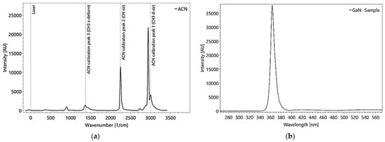Raman calibration using Acetonitrile (Spectrum Analyzer) measured with 30 pulses (a). Fluorescence calibration using a GaN-sample (Spectrum Analyzer), measured with 1 pulse, (b).
