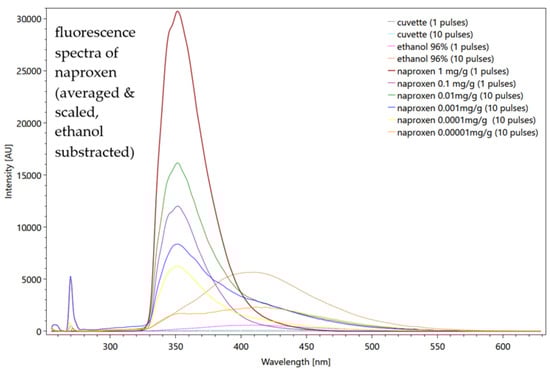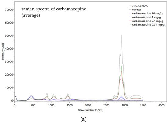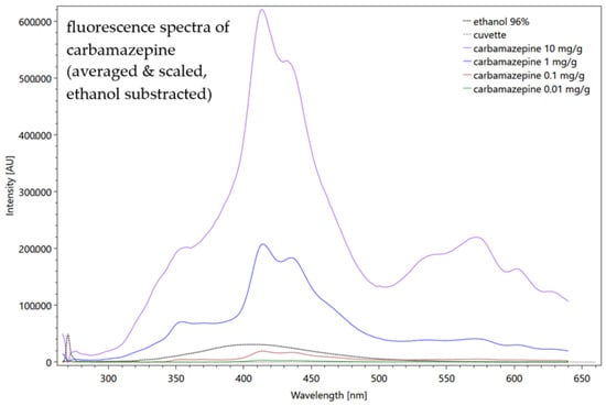 For the identification of the measured substance, the spectrum of the pure substance as a solid, gas or liquid is measured and stored by the database. References for Raman spectra can also be found in the literature or in open-source software []. A simple example for the fluorescence spectra of a dilution series of four concentrations of carbamazepine, diluted in ethanol, and measured in a quartz cuvette is shown in Figure 6.