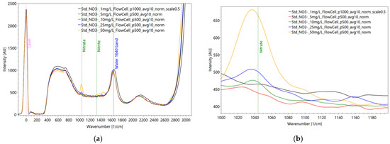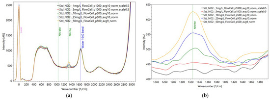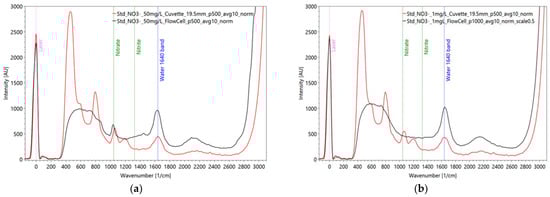 Influence of the measurement set-up on the signal: Raman spectrum of two nitrate solutions with 50 mg/L (a) and 1 mg/L NO3- (b) in a cuvette (red line) and in a flow cell (black line). Critical interpretation arises at the nitrate reference peak at around 1050 1/cm because cuvette and nitrate signal appear at the same wavenumber, indicating the presence of higher nitrate concentrations. Settings: pulse number 500; pulse frequency 40/s; slit size 150 µm; grating 3600 ln/mm; focal length 20 mm (only cuvette) (raw data from []).