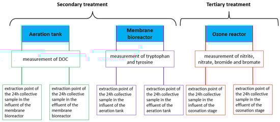 Overview of the extraction points of the 24-h collective samples of two different wastewater treatment plants and their targets around the biological treatment (aeration tank and membrane bioreactor) and the ozonation.
