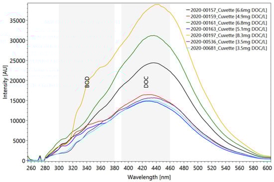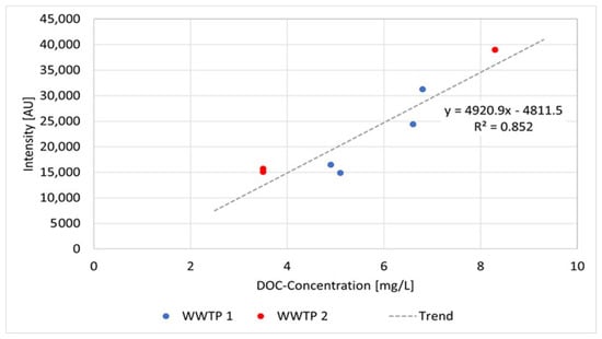 We first examined the capability of fluorescence intensity measurements to correlate with organic carbon concentrations. According to [], fluorescence peaks C in water can be used to estimate DOC, where peak C correlates with the content of dissolved organic carbon in the water. Our results could confirm these observations and transfer them to treated wastewater (Figure 10). The fluorescence analysis of wastewater samples from two different WWTPs after passage through the membrane bioreactor are shown in Figure 9 []. The marked spectra correspond to the DOC concentrations that are estimated in the collaborating laboratory via thermal oxidation and NIR detection DIN EN 1484. There is a clear tendency that the higher the DOC concentration, the higher the peak intensity (except for sample 163). The coefficient of variation from these seven samples ranges from 0.5 to 4.7.