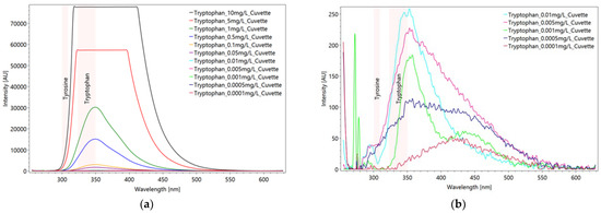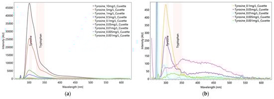 With the aid of the dilution series, the detection limit for the amino acids tyrosine and tryptophan could be determined. Tyrosine proves to be detectable up to 0.05 mg/L, but for tryptophan the spectrometer shows a much greater sensitivity down to 0.001 mg/L (Figure 12b). At lower concentrations, the intensities continue to decrease, and the peaks are strongly affected by solvent and background noise.