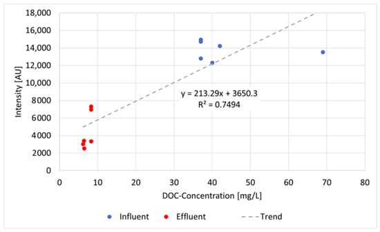 Considering all samples, the coefficient of determination is R2 = 0.75. This result is largely in line with the literature values [,]. Differentiating the extraction points shows that the correlation is significantly higher for the effluent samples (R2 = 0.95) than for the influent samples (R2 = 0.19). This leads to the conclusion that the correlation is higher for water with a low DOC concentration (≤8.3 mg/L in our samples) than for samples with a higher DOC content (≥37 mg/L in our samples). This may also be related to the presence of other interfering substances in the water which are removed in the aeration tank, but strengthens the previous results of the membrane bioreactor.