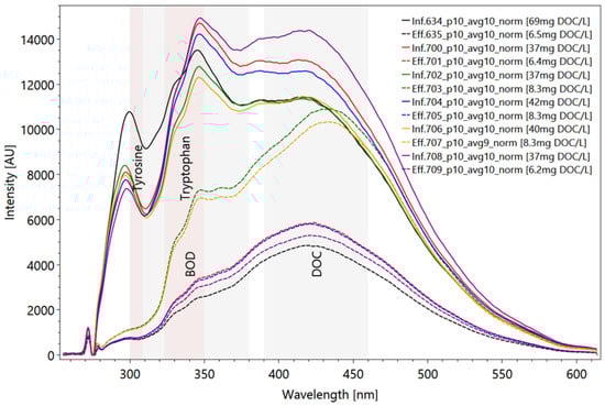 Comparison between the fluorescence spectra of WWTP influent (inf.) (solid lines) and effluent (eff.) (dotted lines) samples of the same sampling day; measurement results after complete processing including subtract spectrum. The reddish background marks the characteristic tyrosine and tryptophan peak areas; the grey background represents the characteristic peaks of DOC and BOD. Influent and effluent samples with sample number and content of DOC (in square brackets), determined in a collaborating laboratory. Settings: pulse number 10; slit size 150 µm; grating 300 ln/mm; focal length 20 mm; pulse frequency 40/s (raw data from []).