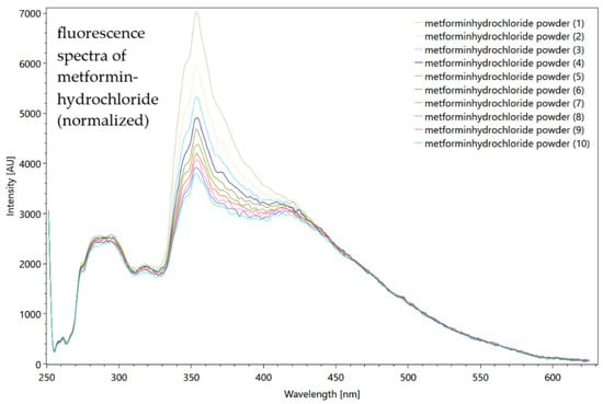 Regarding the pharmaceutical micropollutants, we demonstrate relevant results showing the ability of the spectrometer to detect specific substances, and its suitability for monitoring purposes. The spectra of metformin hydrochloride as a solid shows the trend of photodegradation after 10 measurements (Figure 16).