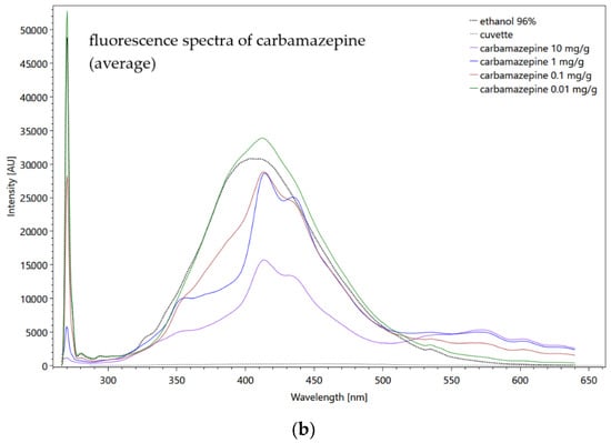 Figure 6 shows the dominance of the solvent ethanol and its influence on the carbamazepine signals. The highly concentrated 10 mg/g carbamazepine signal (purple line) is most attenuated by the solvent and the other substance spectra become increasingly similar to the ethanol spectrum as their concentration decreases (with the exception of 0.01 mg/g, green line). On the other hand, the signal of the quartz cuvette (dotted line grey) offers a very low intensity so that it can be neglected for further fluorescence measurements. The before-described procedure to reduce the influence of the solvent shows Figure 7, where the ethanol spectrum was subtracted and the averaged carbamazepine spectra were scaled and therefore artificially strengthened. As a result, the highly concentrated solution shows the highest intensity of more than 60,000 AU.