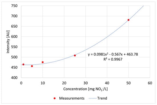 In the further course, the maximum signal intensity of the different concentrated solutions is determined. The corresponding intensities are plotted against the concentration and a calibration curve is generated. From this, the mathematical detection limit of fluorescence spectroscopy for the respective substance can be determined graphically, as well as the accuracy of the measurements. For this purpose, the values of the calibration curve are used as reference values and the relative deviations of the measured spectra to this curve are calculated. If a linear regression results, the coefficient of determination (R2) can be used to estimate the accuracy. If the calibration curve does not yield a linear regression, the relative deviation is determined with Equation (3) [].