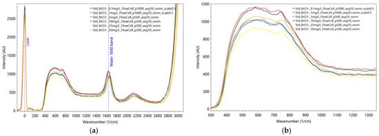 The further processing refers to the fluorescence measurements, whereas Raman data processing was described in detail in a previous paper []. The averaged fluorescence spectrum of the individual concentration is used, from which the spectrum of the solvent has already been subtracted if the substance spectrum has a higher signal intensity than the solvent. In the other case, to prevent negative values for the resulting spectrum, we normalize the solvent spectrum to its initial, sharp peak (Figure 6). This procedure artificially increases the substance signal, in order to reduce masking by the solvent. If this procedure is necessary, a quantitative view on the date is no longer possible, regarding the limits of detection or the evaluation of concentrations.