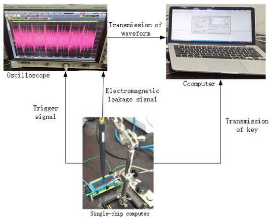 In our experiment, we implement the SPECK algorithm as MCS-51 C codes on STC12C5A60S2 (From Hongjing Technology Company, Shenzhen, China) equipped with a clock frequency of 11.0592 MHz, using a sampling rate of 50 MSa/s. The reason for choosing this single-chip computer is that the instructions are executed in sequence and the execution time is relatively short. This means that there are more encryption rounds of the leakage traces that can be collected under the condition of meeting the Nyquist sampling rate. The characteristic trace is 27,000 electromagnetic leakage traces collected by six rounds of encryption on the single-chip computer in the form of fixed plaintext and random key for a deep-learning attack. Then, while keeping the external conditions such as the single-chip computer and sampling position unchanged, we continue collected 27,000 electromagnetic leakage traces collected by four rounds of encryption on the single-chip computer in the form of random plaintext and fixed key for CPA (Correlation Power Analysis) attack. We use a trigger signal that can indicate the approximate position of the leakage trace in the encryption process. Subsequently, the original data are directly saved without any preprocessing, thus achieving end-to-end modeling. The experimental acquisition platform is shown in Figure 2.