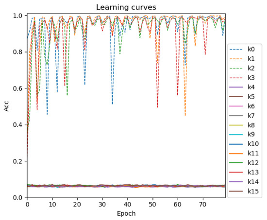 According to the attack principle of energy analysis, the most direct attack method is to directly select the initial key as the attack target of side-channel analysis. The literature [19] proves that directly using the initial key as the attack point can successfully attack the AES algorithm. However, Figure 3 shows the result of directly using the initial key as the attack point to attack the SPECK algorithm. It is noted that for the last 48-bit key, after 80 epochs, the model still does not begin to converge. It is proven that all the keys of the SPECK encryption algorithm cannot be cracked directly using the initial key as the attack point like AES.