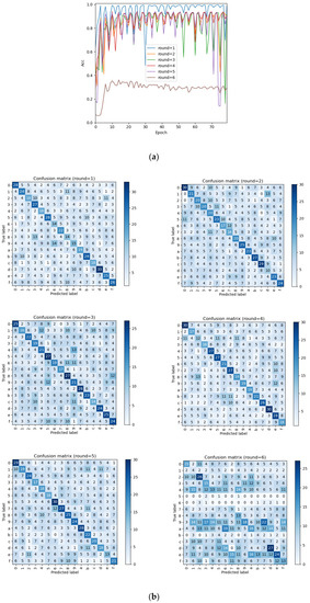 The first half byte attack result of the first six rounds of round keys; they should be listed as: (a) shows the learning curves, and (b) shows the confusion matrix.