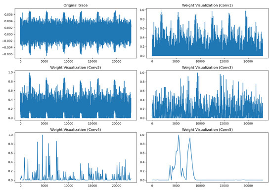 Figure 6 shows that the collected leakage traces have six spikes, representing six rounds of encryption by the SPECK algorithm. We can see that the characteristic data obtained from the shallow convolution layer are still close to the original data, and six spikes can be seen, indicating that the shallow network tends to extract effective information points at the six spikes. As the number of layers is deeper, the features obtained are more and more abstract. Finally, the deep network focuses on a peak area to extract information points. It should be noted that the higher the weight, the greater the contribution of the region to the final prediction results. Through this method, the positions of different bytes of the key on the electromagnetic signal can be located.