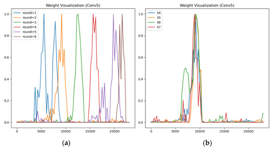 Experiment 1: the same byte position of round keys with different rounds: Taking the model constructed with the first half byte of the round key generated by first six rounds of encryption as the label as an example, we take the weight of the last layer of the model for visualization. It can be observed from the experiment that the positions of the information points corresponding to the six intermediate values are different, which can be roughly regarded as six peaks with intersection (as shown in Figure 7a). It proves that although these models are trained by the intermediate values obtained from different round functions, the network still extracts similar features. When generating the round key, the key not only uses the initial key corresponding to the round, but also is related to the round key of the previous round. That is, it is related to the initial key used in the previous rounds. There is the “reusability” of the key, which is reflected in the collected leakage traces and observed through visual analysis.