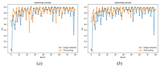 The experimental results are shown in Figure 8. Through transfer learning, 65% accuracy can be achieved in the first epoch. Only 3–4 epochs can be trained to make the model converge to a better result, and the recognition accuracy is more stable. However, the training method without transfer learning needs to train at least eight epochs to achieve the same result due to the random initialization of weight, and the recognition accuracy is not stable. Therefore, the transfer learning method of side-channel attack can make use of the similarity of different bytes of the key, and has higher performance starting point, faster model convergence speed and more stable recognition accuracy.