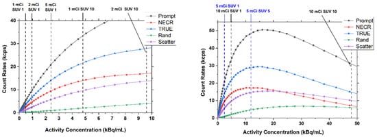 | PET System | Efficiency at Peak Count Rate (cps/MBq) | Peak NECR (kcps) | Concentration at Peak NECR (kBq/mL) | Phantom Volume (mL) | Activity at Peak NECR (MBq) |