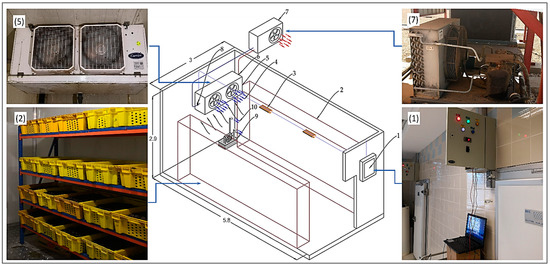 The main component of the cold storage room (dimensions in m). (1) Control unit, (2) storage shelves, (3) LED light bulbs, (4) cold air direction, (5) evaporator unit, (6) electrically operated expansion device, (7) condensing unit, (8) pressure transmitter, (9) ultrasonic humidifier, (10) outputted mist (all dimensions in meters).