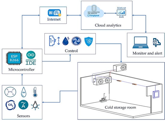 The detailed workflow and communication among the different entities of the designed IoT-based control system (IoT-BC) are shown in Figure 2. The figure shows the modified cold storage room (MCSR) that was monitored and controlled remotely. In addition, a set of sensors and microcontrollers for collecting data were used to control and monitor the selected parameters. The communication between the different entities is as follows: