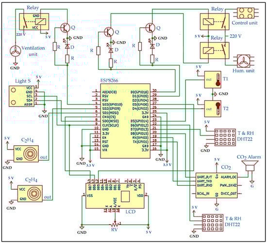 This section introduces the schematic diagrams in IoT-BC, the description of the used sensors, and the calibration of the sensor. The hardware layout has been implemented using KiCad version 6.0 installed on MacBook Pro (3.3 GHz Intel Core i7) to draw the expected IoT-BC schematic and confirm the electrical rules check, as shown in Figure 3. KiCad has been used for its ability to handle and maintain various and complex electronic circuits. For example, two circuits were used to monitor and control the controlled atmosphere storage: one circuit for the internal atmosphere storage, and the second circuit for the compressor operations.