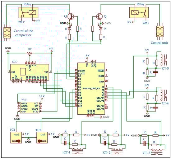 The detailed schematic KiCad diagram with successful electrical rules checks for the current meters and power control. C is a capacitor, D is a diode, GND is the ground, Q is transistor (BC547), R is a resistor, RV rheostat, TC1 and TC2 are temperature sensors of the compressor (DS1822), LCD is a liquid crystal display (RC1602A-GHW-ESX), CT-1, CT-2 and CT-3 is the current meter of the compressor, CT-4 is the current meter of the condensing unit, CT-5 is the current meter of the control unit, WI-FI is a Wi-Fi module (ESP-01090).
