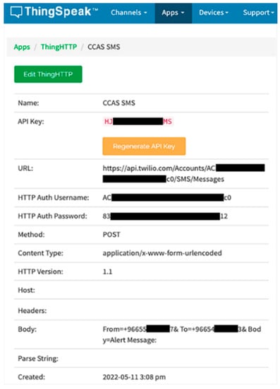 The alert in IoT-BC is an email and SMS for a designated administrator through our private channel on the ThingSpeak cloud platform. The configuration for sending an email is achieved using MATLAB Analysis App on ThingSpeak. Where a MATLAB code is written in the MTLAB Analysis App for each controlled parameter. Additionally, the configuration of sending an SMS using ThingSpeak and the Twilio website is shown in Figure 6. The figure shows the detailed configuration for sending an SMS as an alert by using the Twilio website and ThingHTTP App on our private channel on the ThingSpeak cloud platform.