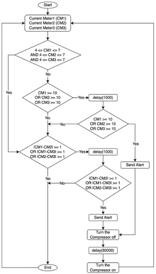 Figure 9. The compressor control and alert based on three current meters measures (CM1, CM2, and CM3).