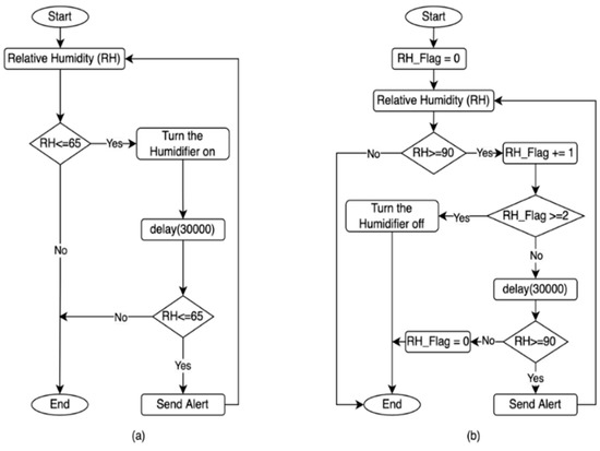 The process of controlling the humidification unit in the MCSR has been accomplished based on the internal relative humidity (RH) measured by the DHT22 sensor, as shown in Figure 10. This figure is composed of two subgraphs:
