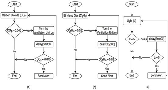 IoT-BC’s control and the alert system have been introduced to control the compressor, the ventilation unit, and the humidification unit. As well as sending alerts to a designated administrator based on the measures of some sensors. Moreover, sending an alert based on the light level inside the atmosphere storage. In comparison to the Supervisory Control and Data Acquisition (SCADA) system which is very similar to the designed IoT-BC. The SCADA system could remotely control huge industrial processes in real-time based on high-level software applications. Additionally, a trained user is needed to use the SCAD system. Thus, the SCADA system is most suitable for the high cost and huge industrial facilities, as it is very expensive. The SCADA system also needs huge computational resources to work properly. On the other hand, the designed IoT-BC could achieve the same objectives as the SCADA system with low cost for the small to medium-sized industrial facilities. Moreover, the designed IoT-BC requires a simple IoT microcontroller and sensors along with a free cloud platform. Additionally, the normal user can use IoT-BC’s interface as it is very simple and easy to use.